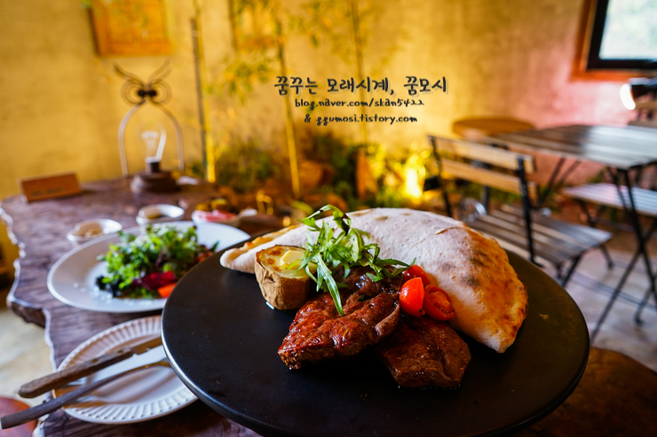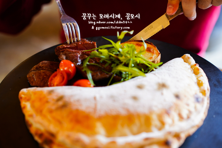 부채살 스테이크와 플레인 깔조네, 화덕감자구이가 한 접시에 담겨나왔습니다.