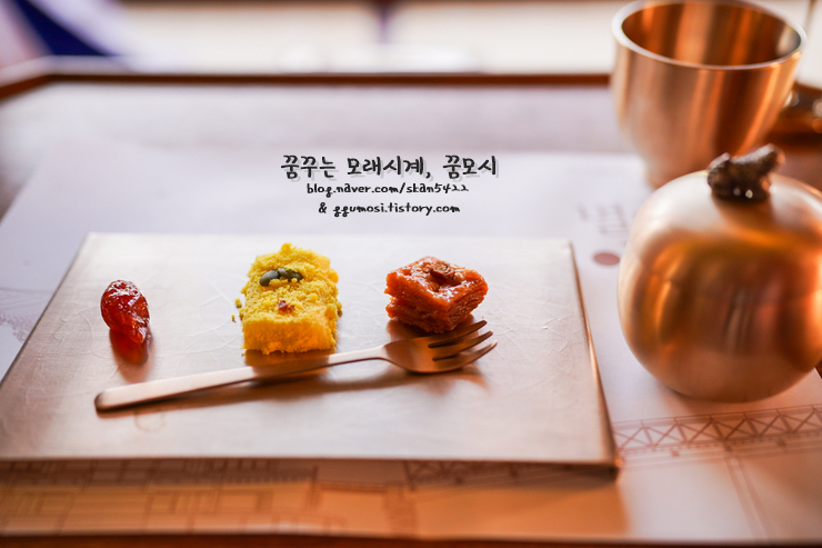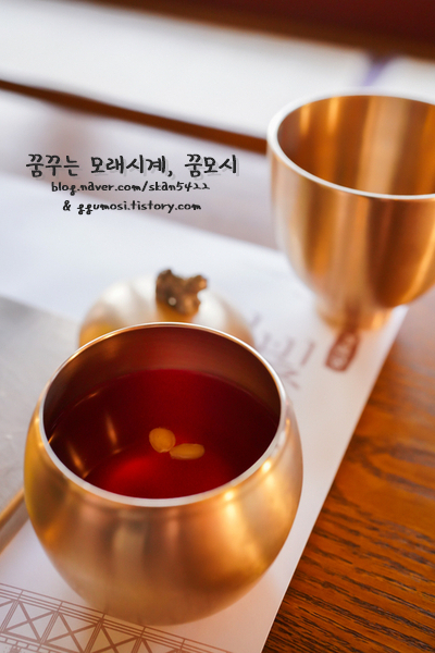 모약과와 꽃인절미, 정과가 나오고 오미자차가 나왔습니다.