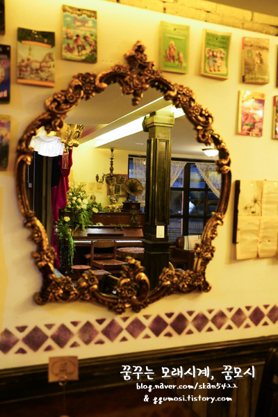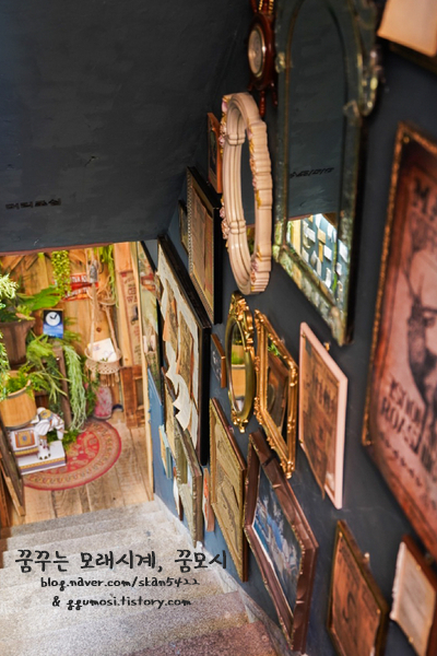 2층으로 오르는 계단 벽엔 액자와 거울이 가득했고