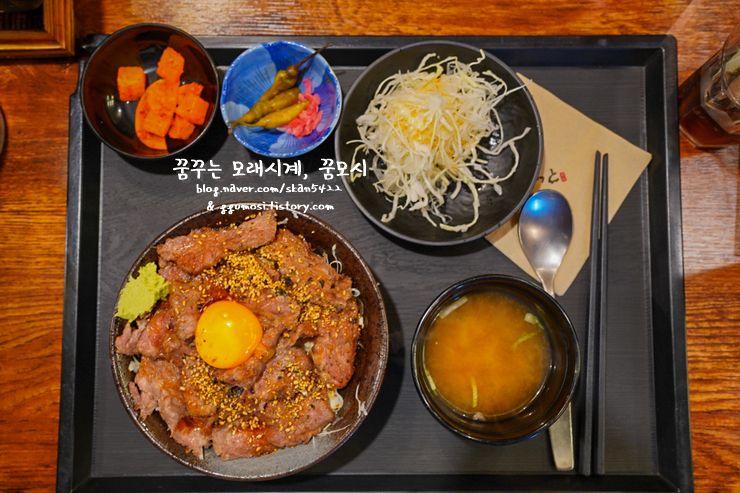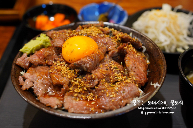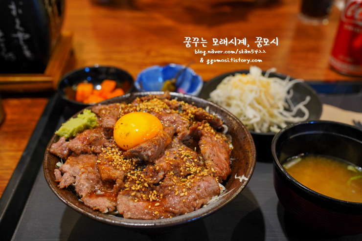 달달하고 짭짤한 노른자 장과 곁들여 먹는 후라토식당의 스테이크 소고기 덮밥.