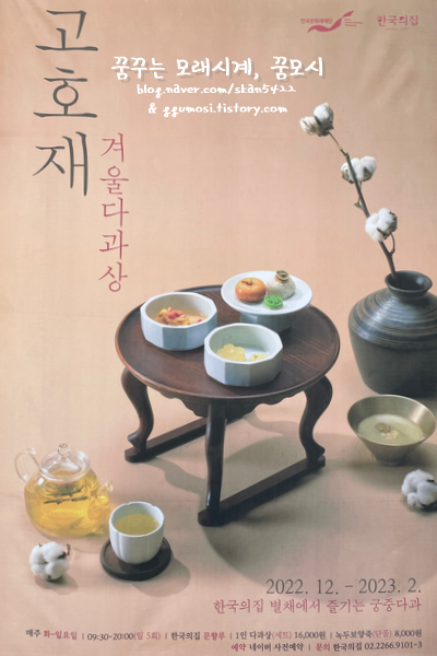 [프로그램명] 한국의집 궁중다과 '고호재(겨울 다과상)' [운영기간] 2022. 12. 7.(수) ~ 2023. 2. 26.(일) [운영일자] 매주 화 ~ 일요일 [운영시간] - 1부 : 09:30 ~ 11:00(90분) - 2부 : 11:30 ~ 13:00(90분) - 3부 : 13:30 ~