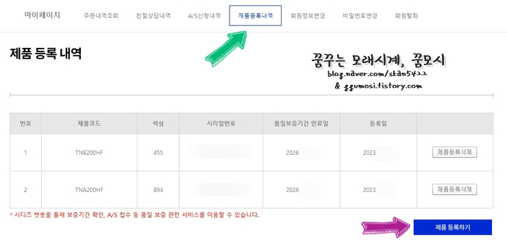 2) 사이드 상단 오른쪽에 마이페이지로 들어가 제품등록내역(초록색 화살표)를 클릭!!!