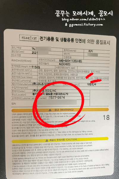 의자 아래 부착된 품질보증서 시리얼 넘버만 확인되면 걱정 끝!!!!!!!