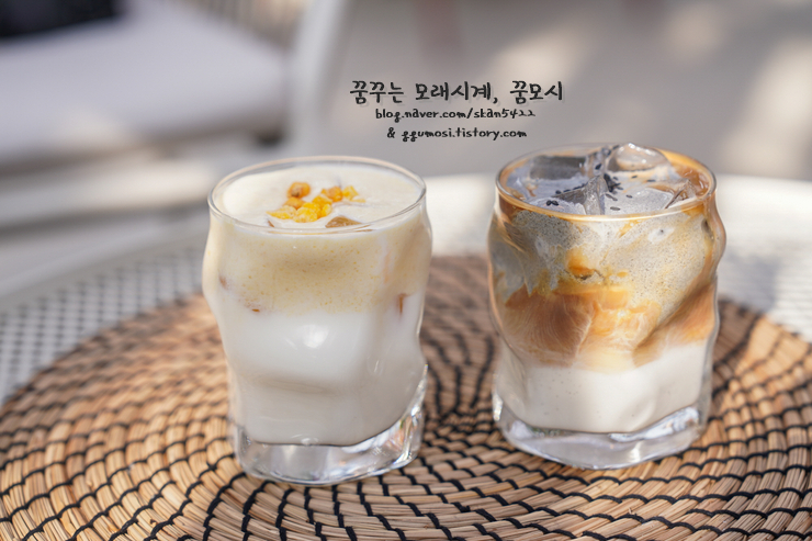 흑임자 크림 라떼와 옥수수 크림 라떼는 독특한 디자인의 잔에 나왔습니다.