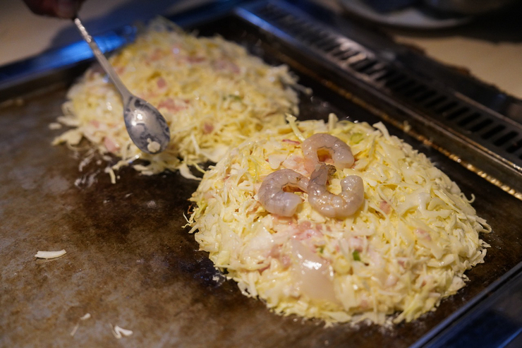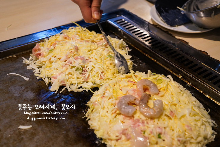 두가지 #오꼬노미야끼 를 뜨거워진 철판에 올려주시는데