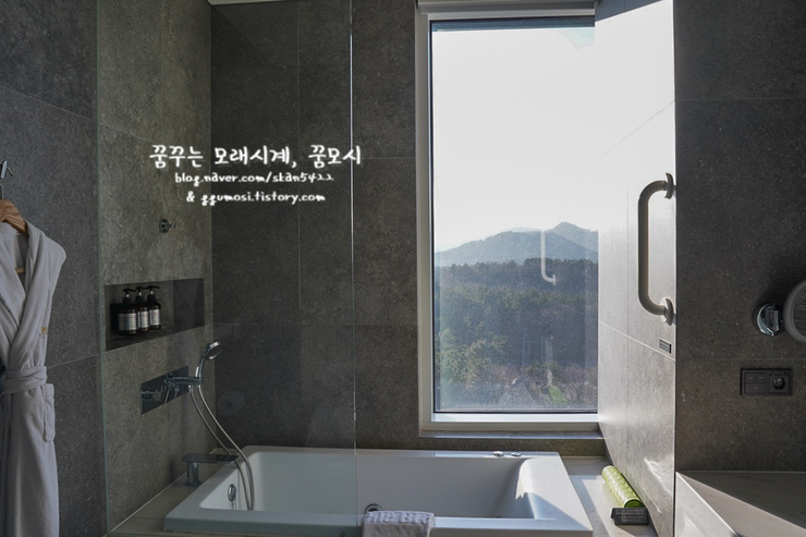 욕실엔 욕조가 창가 바로 앞에 있고 핸드타월&배스타월, 목욕&바디용품은 대용량으로 준비되어 있습니다.