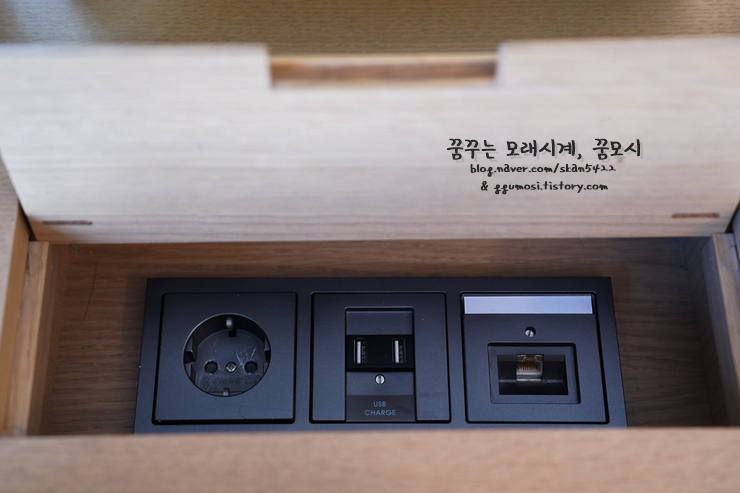책상 위엔 전등이 올려져있고 콘센트는 숨겨져 있어요. ㅋㅋㅋ