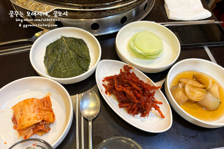 기본반찬이 먼저 나오고 오리고기도 나와줍니다.
