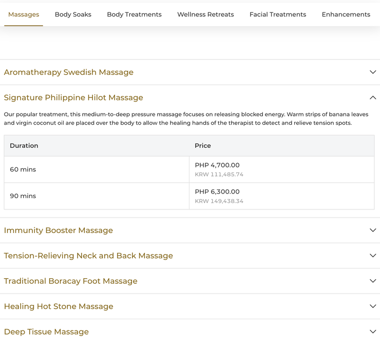 Signature Philippine Hilot Massage/시그니처 필리핀 힐롯 마사지 90분 코스를 골랐어요.