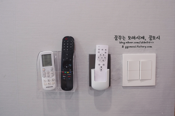 리모컨도 벽 한켠에 깔끔하게 정리되어 있고 냉장고와 전자레인지, 밥솥 등 소형가전도 놓여 있어요.