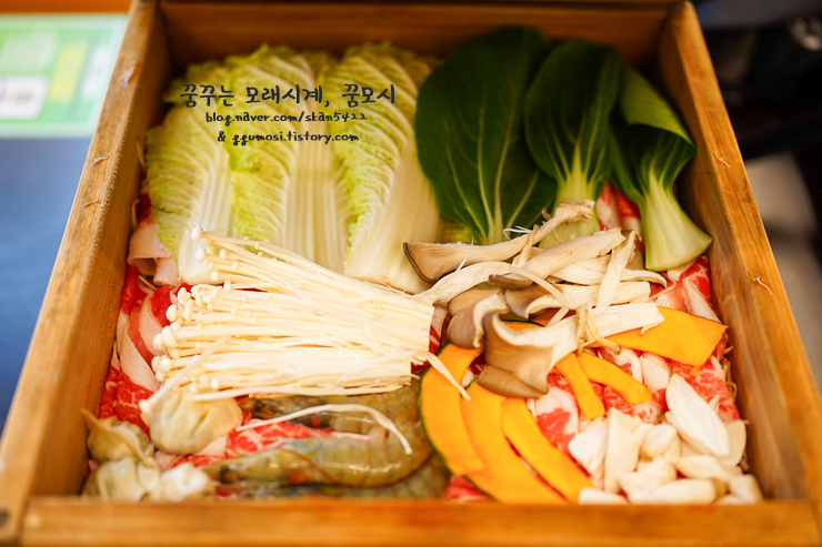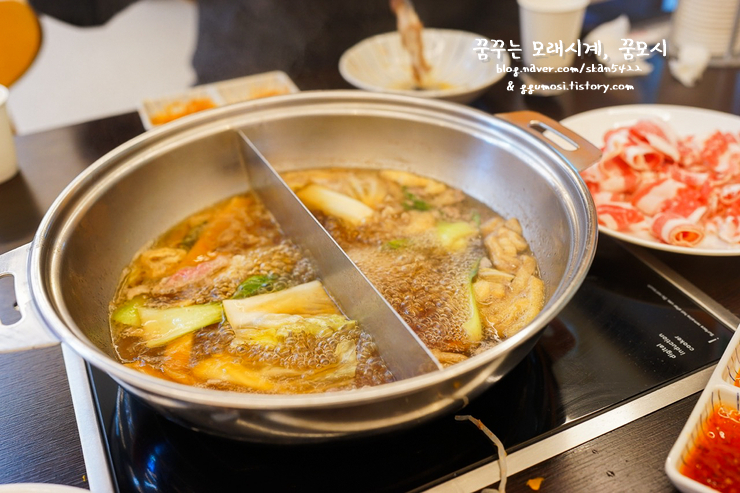 샤브샤브는 두가지 다 순한 맛을 골랐는데 꿈남편을 위해 하나는 마라를 선택할 걸 싶더라구요.