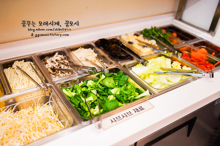 주문하고 빠르게 셀프코너에 가서 샤브샤브에 넣을 채소와 버섯 등 담아오고 고기도 담아왔습니다.