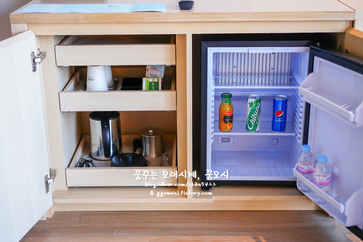 냉장고엔 생수 2병과 음료 3캔이 들어있는데 무료예요.